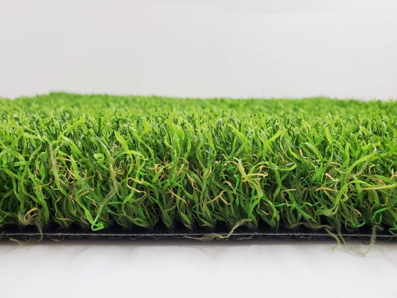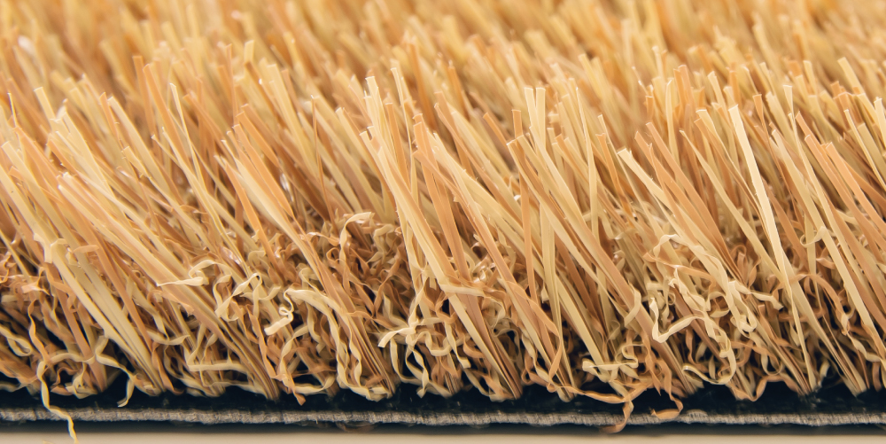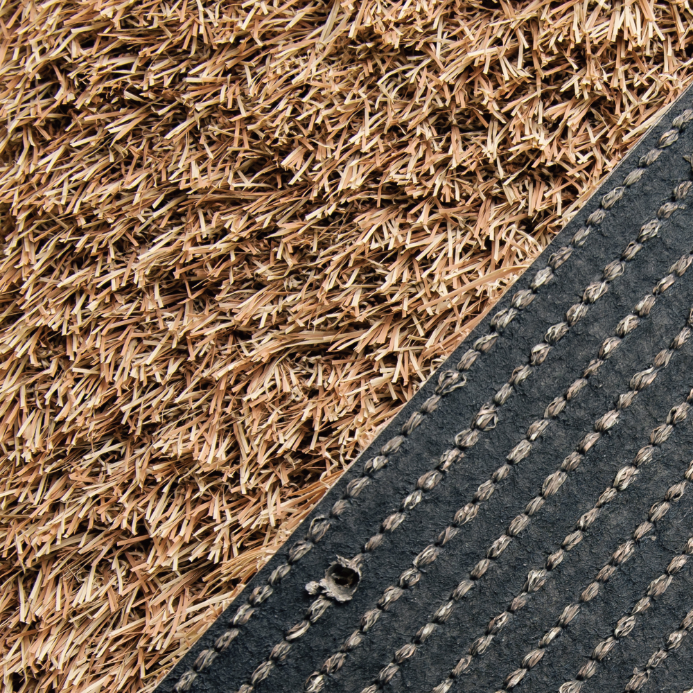 インテリア的な要素も持った、柔らかな色合いが特徴的なブラウンカラーの人工芝。芝葉は濃淡2色の深い色合い。