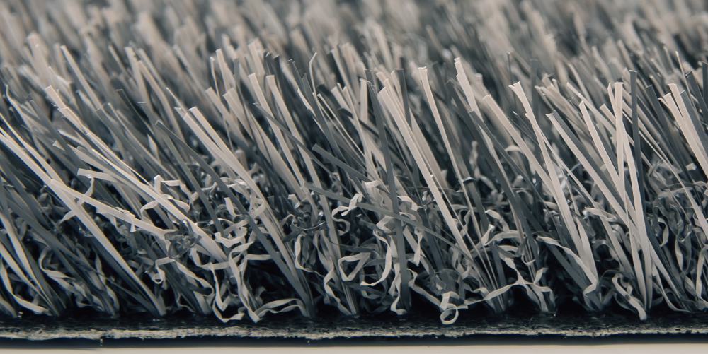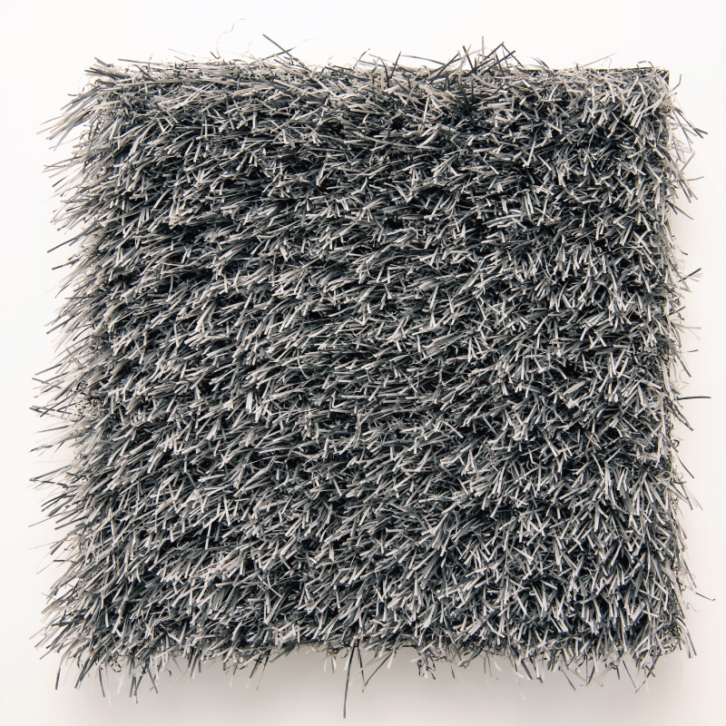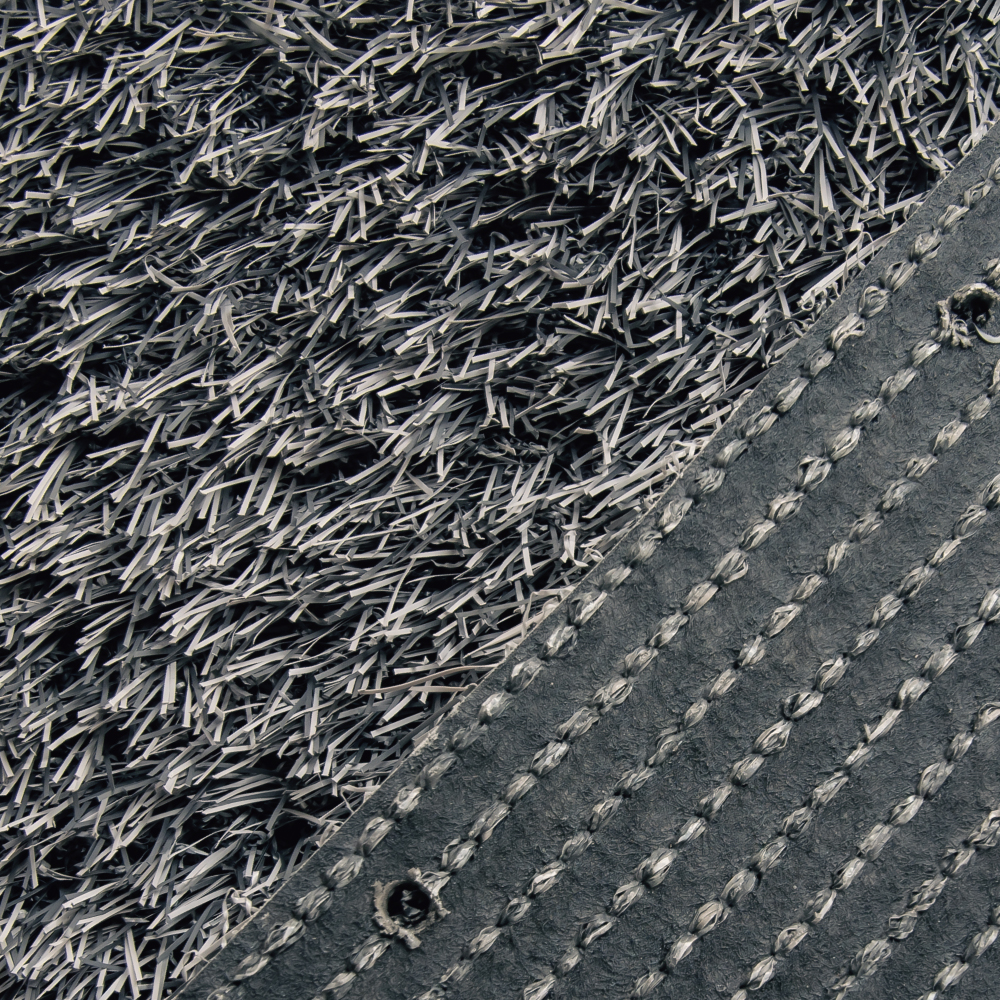 インテリア的な要素も持った、こだわりのグレー人工芝。芝葉は濃淡2色の深い色合い。