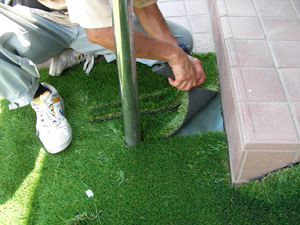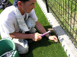 熟練の職人が下地や場所に応じて、いよいよ人工芝を施設していきます!